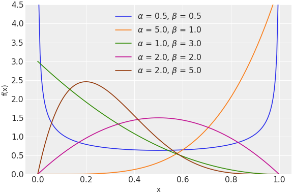 \[f(x \mid \alpha, \beta) = \frac{x^{\alpha - 1} (1 - x)^{\beta - 1}}{B(\alpha, \beta)}\]where \(B\) is the Beta function.
