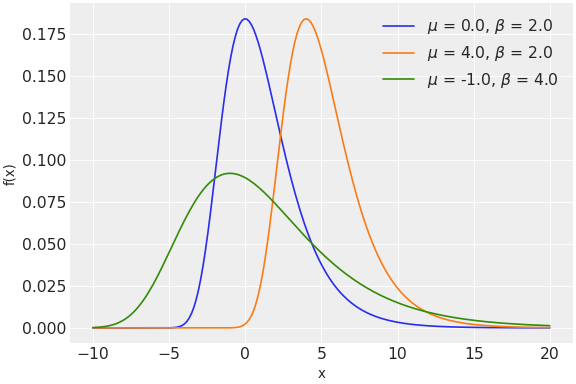 \[f(x \mid \mu, \beta) = \frac{1}{\beta}e^{-(z + e^{-z})}\]where