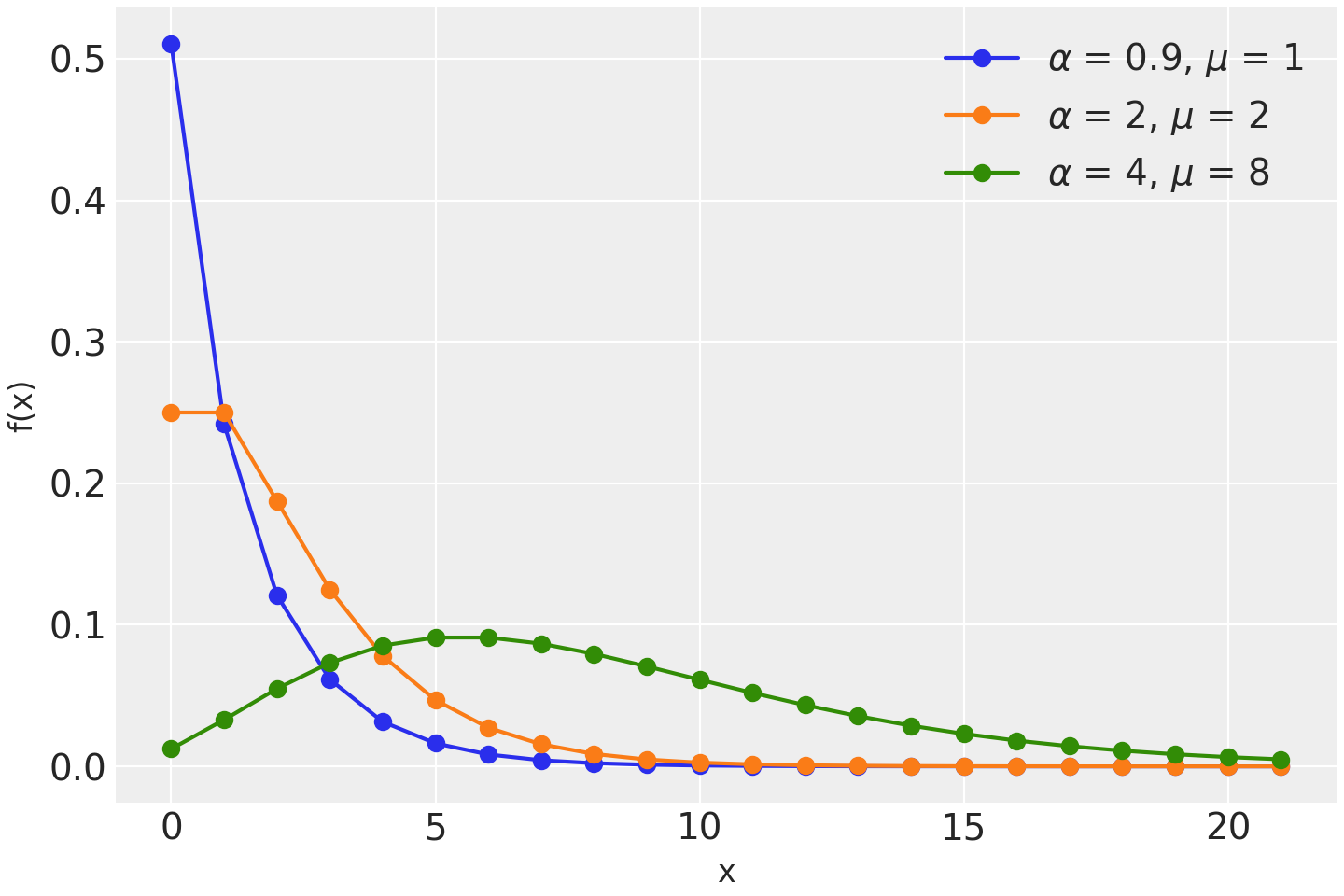 \[\begin{split}p &= \frac{\alpha}{\mu + \alpha} \\ n &= \alpha\end{split}\]If it is parametrized in terms of n and p, the negative binomial describes the probability to have x failures before the n-th success, given the probability p of success in each trial. Its pmf is