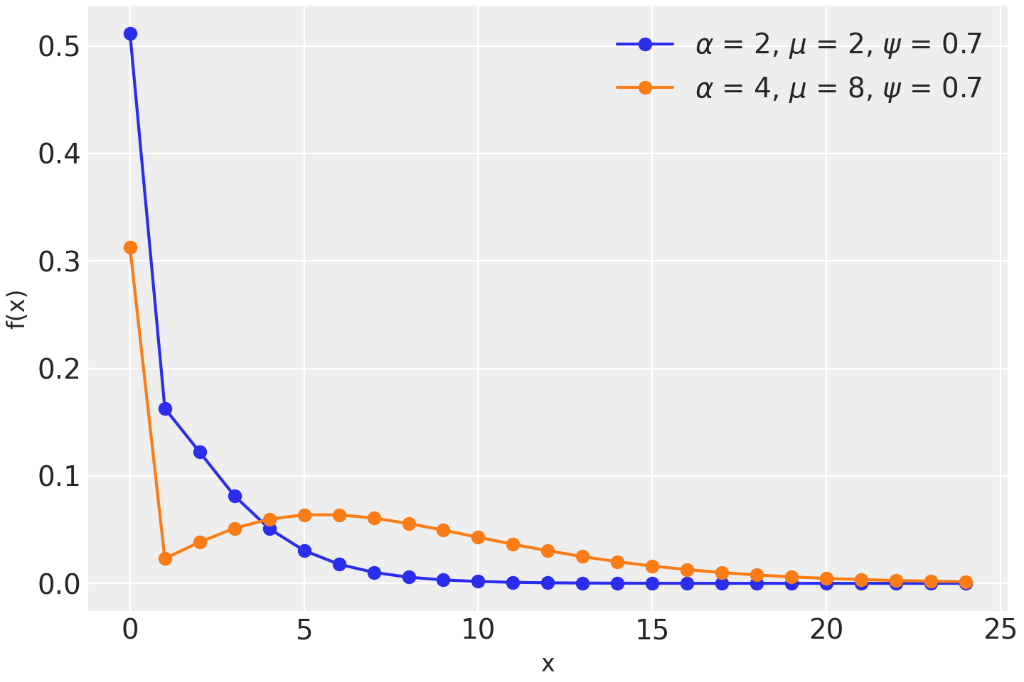 \[\begin{split}f(x \mid \psi, \mu, \alpha) = \left\{ \begin{array}{l} (1-\psi) + \psi \left ( \frac{\alpha}{\alpha+\mu} \right) ^\alpha, \text{if } x = 0 \\ \psi \frac{\Gamma(x+\alpha)}{x! \Gamma(\alpha)} \left ( \frac{\alpha}{\mu+\alpha} \right)^\alpha \left( \frac{\mu}{\mu+\alpha} \right)^x, \text{if } x=1,2,3,\ldots \end{array} \right.\end{split}\](